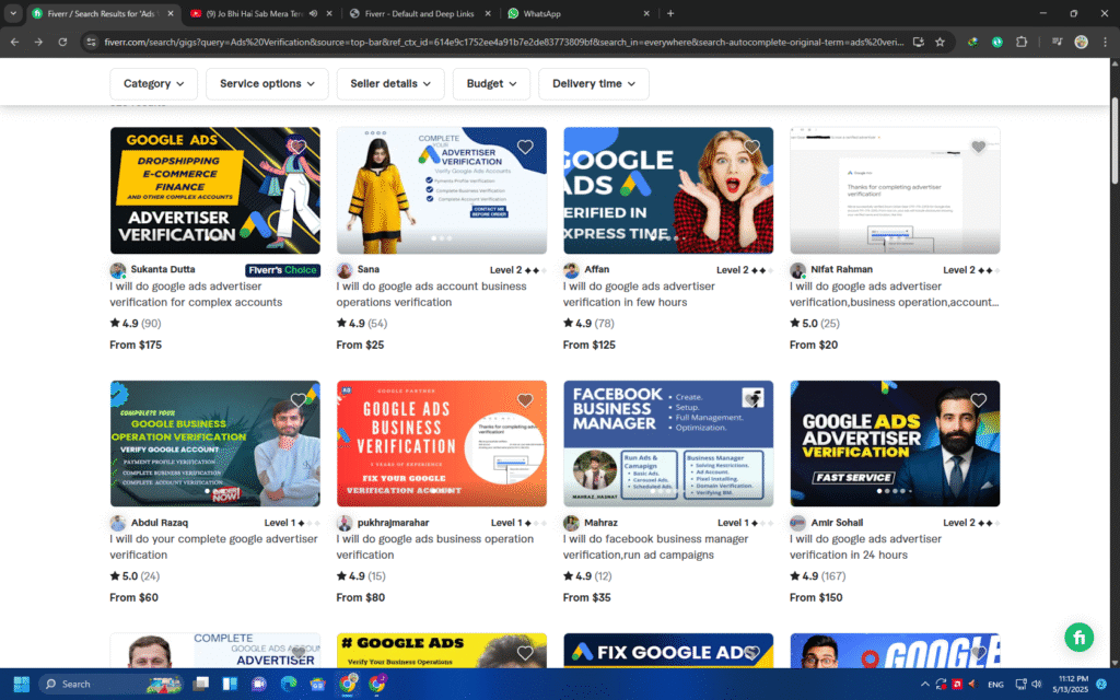 | Affan | Level 2 | ⭐ 4.9 | Google Ads Advertiser Verification in few hours | $125 | Visit Gig |